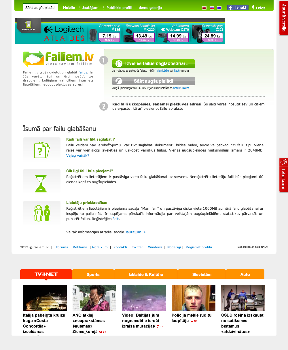 Uzzināju, ka mājas lapa “Failiem.lv”, kuru arī šim mērķim laiku pa laikam izmantoju, ir izstrādājis un ieviesis jaunu dizainu, kā arī uzlabojis savu darbību. Nezinātājiem – “Failiem.lv” piedāvā iespēju augšupielādēt lielākus (līdz pat 2 Gb vienā paņēmienā un bez jebkādas reģistrācijas) un mazākus failus, lai tos nodotu citiem cilvēkiem vai vienkārši noglabātu attālinātai pieejai.